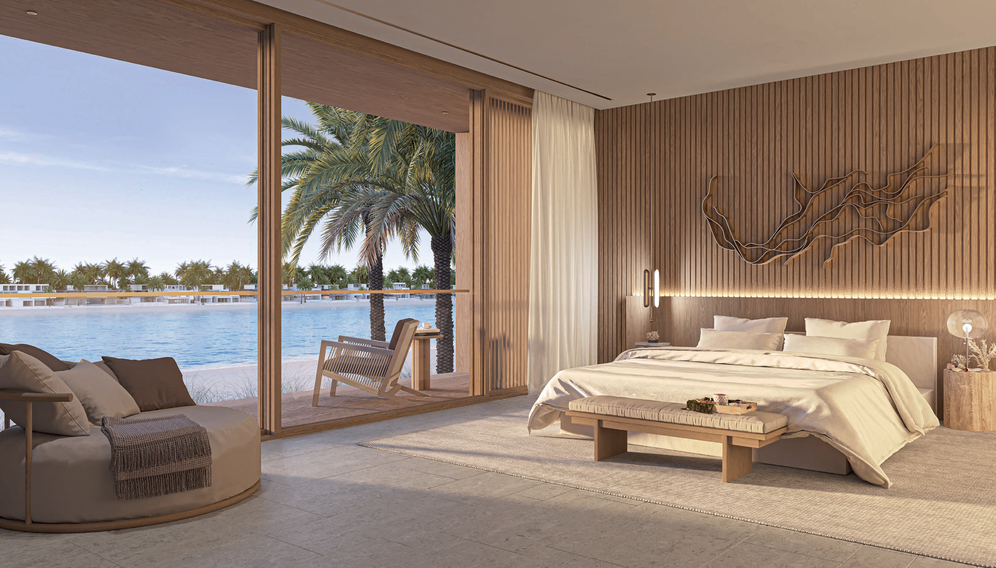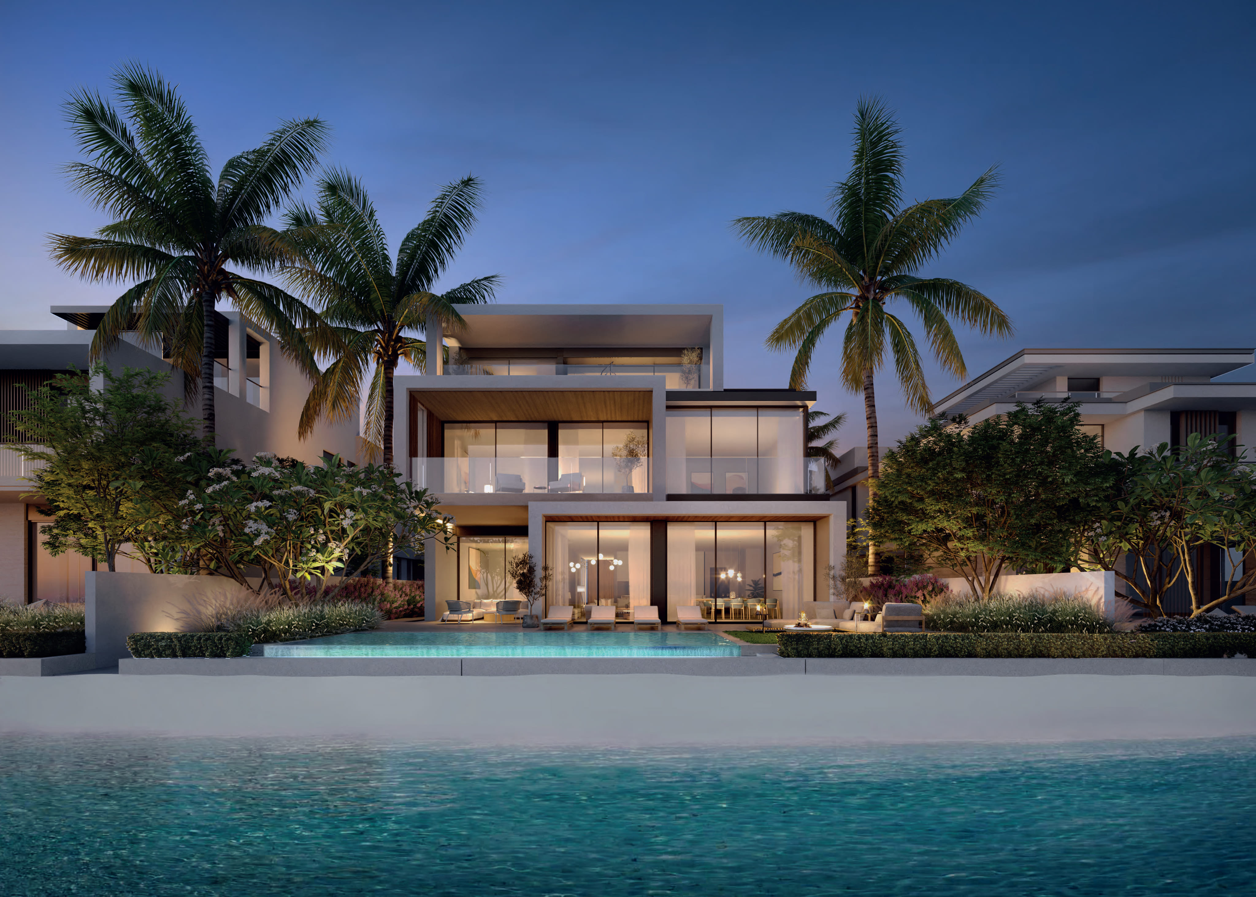 Nakheel Palm Jebel Ali creates a dialogue between land and sea. The Coral Collection villas act as sculptural landmarks with expressive designs against the horizon. In contrast, The Beach Collection captures a horizontal rhythm, seamlessly blending terraces with living areas and the Gulf's soft blues. Every home is a bespoke statement of coastal serenity.